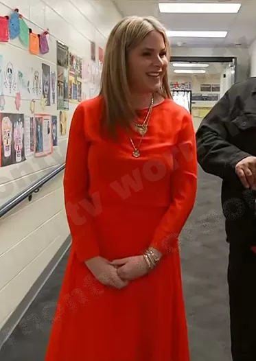 Jenna Bush Hager on Today on NBC was spotted wearing this red long sleeve midi dress on Today on Aug 28 2023's episode. Jenna's Dress is the Long Loose Dress in Red by Maje.