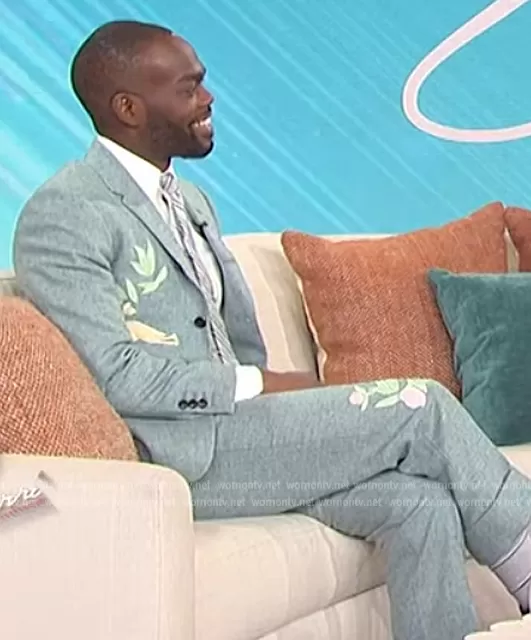 on Sherri on FOX was spotted wearing this green floral embroidered blazer and pants on Sherri on Feb 13 2023's episode. 's Blazer is the Applique detail Single Breasted Blazer by Thom Browne . 's Pants is the Floral-appliqué cropped trousers by Thom Browne.