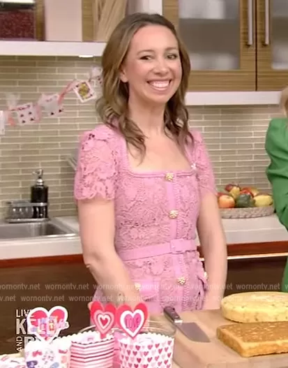 on Live with Kelly and Mark on Disney ABC Home Entertainment was spotted wearing this pink lace dress on Live with Kelly and Ryan on Feb 13 2023's episode. 's Dress is the Giupure Lace Button-Front Midi Dress by Self Portrait.