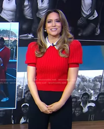 Rhiannon Ally on Good Morning America on ABC was spotted wearing this red cable knit puff sleeve sweater on Good Morning America on Oct 20 2025's episode. Rhiannon's Sweater is the Chase Cable-Knit Puff-Sleeve Sweater in Perfect Ruby White by Alice + Olivia.