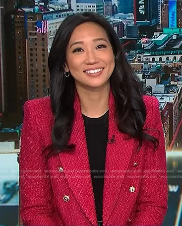 on NBC News Daily on NBC was spotted wearing this pink tweed blazer on NBC News Daily on Feb 10 2023's episode. 's Jacket is the Textured Blazer with Button Details in Fuchsia by Zara.