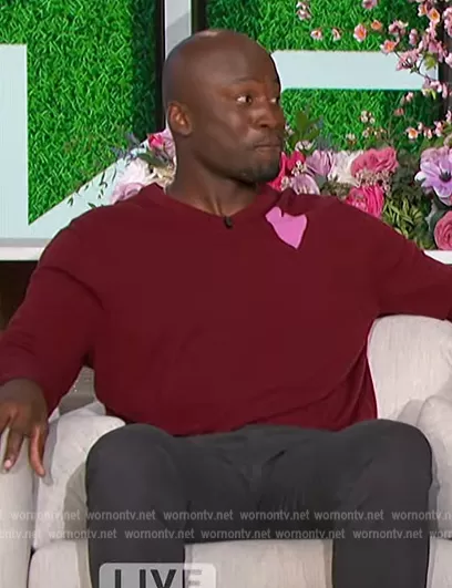 Akbar Gbajabiamila on The Talk on CBS was spotted wearing this red heart print sweater on The Talk on Feb 13 2023's episode. Akbar's Sweater is the Lover V-neck Sweater by Mr Turk.