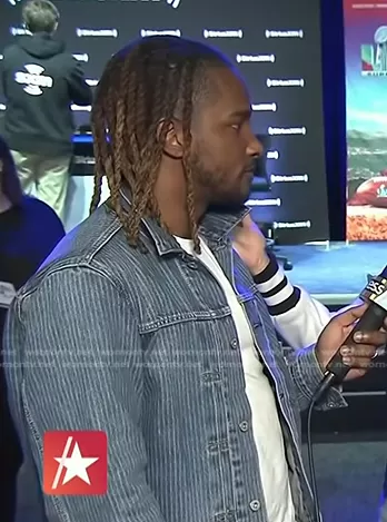 Scott Evans on Access Hollywood on NBC was spotted wearing this striped denim jacket on Access Hollywood on Apr 24 2023's episode. Scott's Jacket is the Type I denim Trucker Jacket in blue with stripe by Levi's.