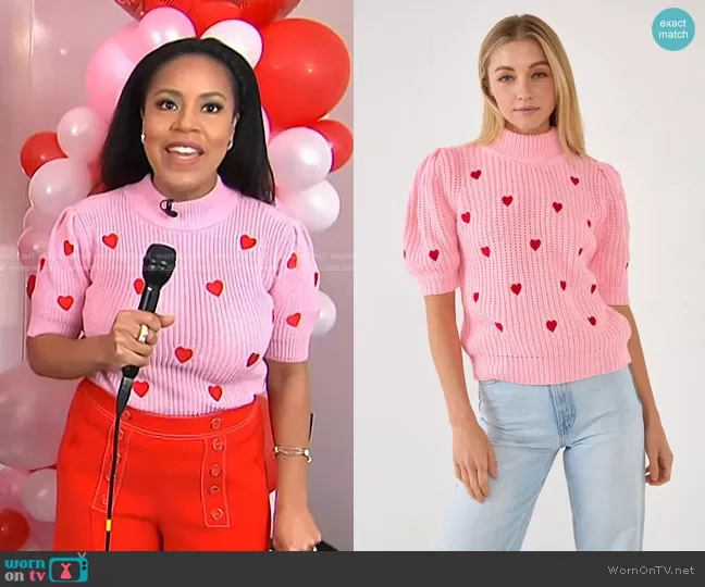Sheinelle Jones on Today on NBC was spotted wearing this pink heart sweater on Today on Feb 14 2023's episode. Sheinelle's Sweater is the Heart Sweater by English Factory.