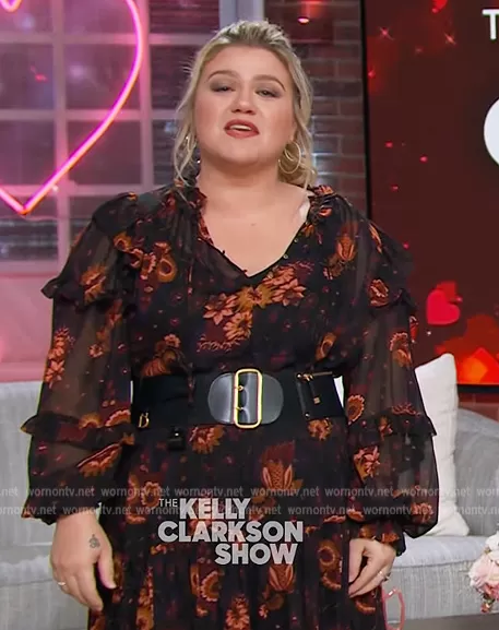 Kelly Clarkson on The Kelly Clarkson Show on NBC was spotted wearing this black floral print ruffle blouse and skirt on The Kelly Clarkson Show on Feb 14 2023's episode. Kelly's Dress is the Miray Floral Ruffled Silk Blouse by Ulla Johnson . Kelly's Skirt is the Rita Skirt by Ulla Johnson.