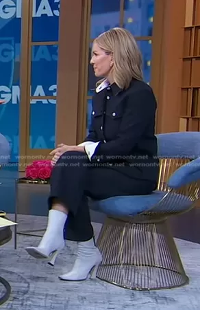 Dr. Jennifer Ashton on Good Morning America on ABC was spotted wearing this navy button down shirt on Good Morning America on Feb 14 2023's episode. Jennifer's Top is the Button-Front Denim-Twill Shirt by Meryll Rogge . Jennifer's Shoes is the Nappa Boots by Fendi.
