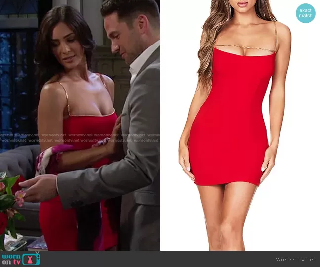 Gabi Hernandez (played by Camila Banus) on Days of our Lives on Peacock was spotted wearing this red chain strap mini dress on Days of our Lives on Feb 15 2023's episode. Gabi (old)'s Dress is the Lexi Chain Mini Dress by Nookie.