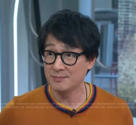 on Today on NBC was spotted wearing this orange striped neck sweater on Today on Feb 15 2023's episode. 's Sweater is the Washable Wool Artist Stripe Sweater by Paul Smith.