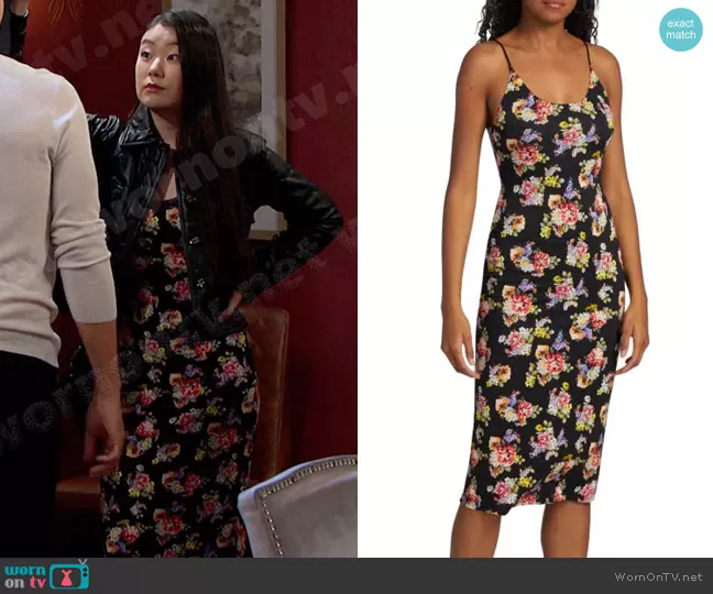 Wendy Shin (played by Victoria Grace) on Days of our Lives on Peacock was spotted wearing this black floral dress on Days of our Lives on Feb 16 2023's episode. Wendy's Dress is the Delora Fitted Floral Midi Dress by Alice + Olivia . Wendy's Jacket is the Faux Leather Jacket by Maeve.