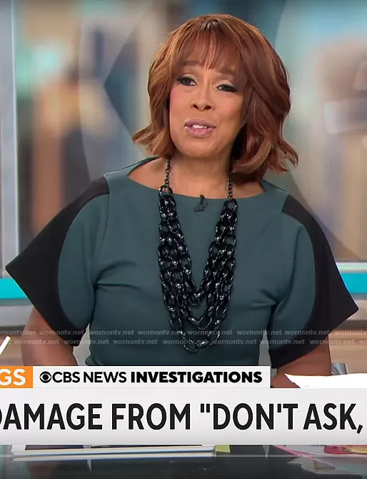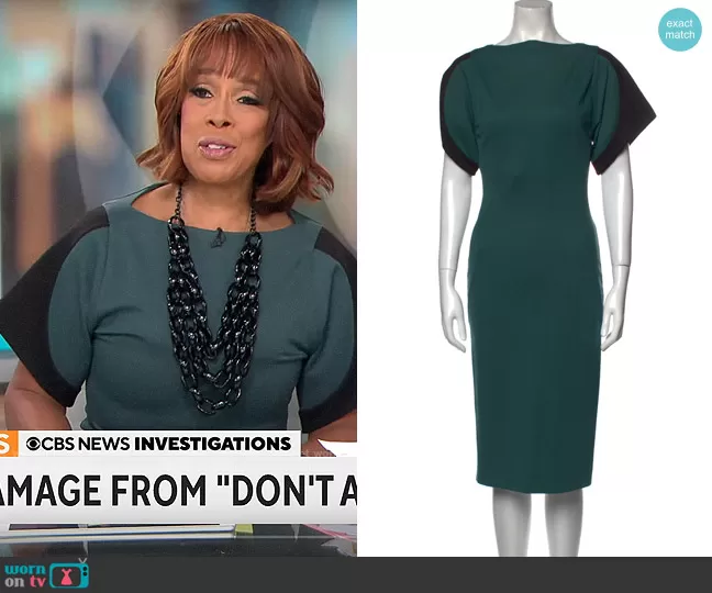 Gayle King on CBS Mornings on CBS was spotted wearing this green and black dress on CBS Mornings on Sep 18 2023's episode. Gayle's Dress is the Bateau Neckline Dress by Antonio Berardi .