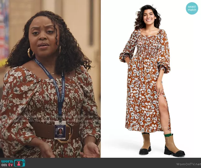 Janine Teagues (played by Quinta Brunson) on Abbott Elementary on ABC was spotted wearing this brown floral print dress on Abbott Elementary on episode 'Fire' (2x15) in Feb 2023. Janine's Dress is the Floral Smocked Bodice Midi Dress by La Ligne x Target.