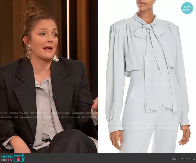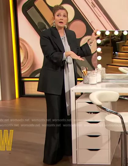 Drew Barrymore on The Drew Barrymore Show on CBS was spotted wearing this black blazer and pants on The Drew Barrymore Show on Feb 16 2023's episode. Drew's Top is the Bow Front Blouse by Alberta Ferretti . Drew's Blazer is the Armoured Silk & Wool Tuxedo Jacket by Chloe . Drew's Pants is the High Waist Armored Silk & Wool Wide Leg Pants by Chloe.