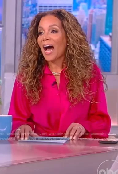 Sunny Hostin on The View on ABC was spotted wearing this pink satin wrap dress on The View on Feb 16 2023's episode. Sunny's Dress is the Talita wrap-effect satin midi dress by Jonathan Simkhai.