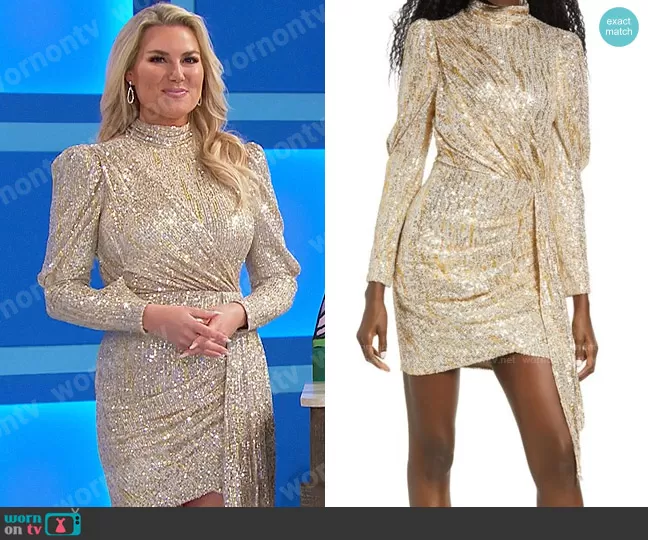 Rachel Reynolds on The Price is Right on CBS was spotted wearing this gold sequin turtleneck dress on The Price is Right on Feb 16 2023's episode. Rachel's Dress is the Bianca Dress by Saylor.