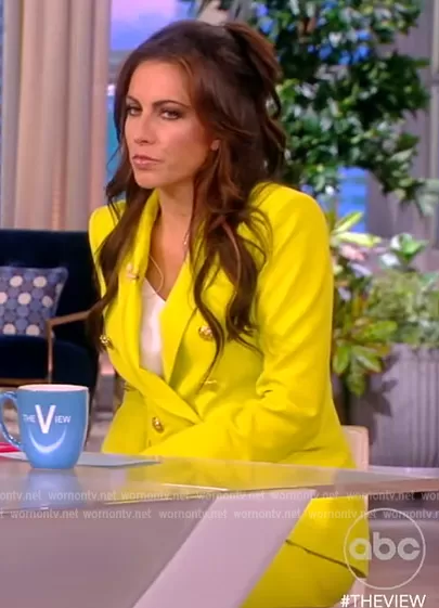 Alyssa Farah Griffin on The View on ABC was spotted wearing this yellow double breasted blazer on The View on Feb 17 2023's episode. Alyssa's Blazer is the Miller Jacket by Veronica Beard . Alyssa's Pants is the Kanto Pants by Veronica Beard.