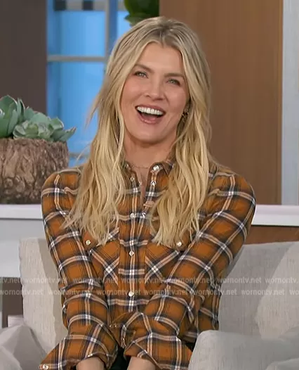 Amanda Kloots on The Talk on CBS was spotted wearing this orange plaid shirt on The Talk on Feb 17 2023's episode. Amanda's Top is the Barnette Plaid Cotton Flannel Shirt by Veronica Beard.