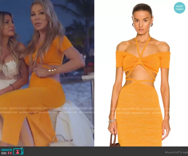 Lisa Hochstein (played by Lisa Hochstein) on The Real Housewives of Miami on Peacock was spotted wearing this orange knit top and skirt on The Real Housewives of Miami on episode 'Rage, Release, Repeat' (5x14) in Feb 2023. Lisa's Top is the Cessaly Knit Top by Cult Gaia . Lisa's Skirt is the Hedda Skirt by Gult Gaia.