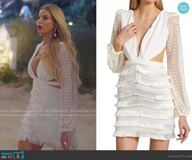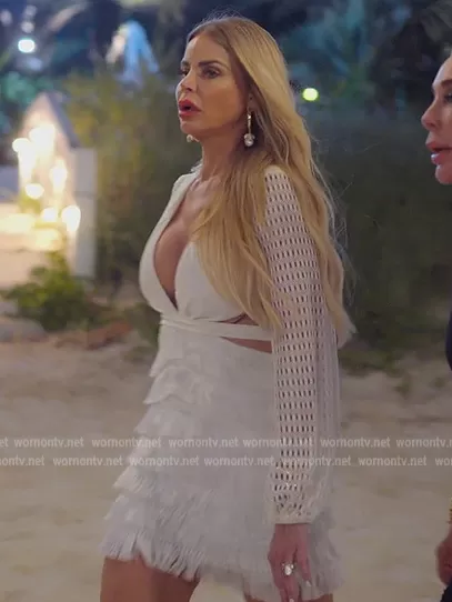 Alexia Echevarria (played by Alexia Echevarria) on The Real Housewives of Miami on Peacock was spotted wearing this white fringe trim mini dress on The Real Housewives of Miami on episode 'Rage, Release, Repeat' (5x14) in Feb 2023. Alexia's Dress is the Eyelet & Fringe Mini Dress by Patbo.