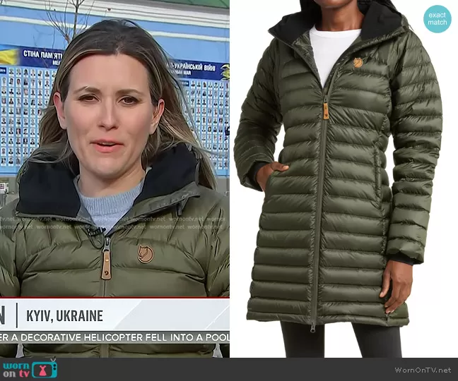 on Today on NBC was spotted wearing this Erin McLaughlin’s green puffer jacket on Today on Feb 20 2023's episode. 's Jacket is the Snowflake Long Down Parka by Fjallraven.