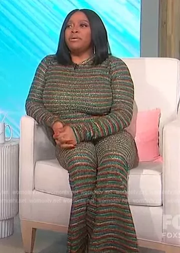 Sherri Shepherd on Sherri on FOX was spotted wearing this metallic stripe top and pants on Sherri on Feb 20 2023's episode. Sherri's Top is the Disco Striped Metallic Top by Bruce Glen . Sherri's Skirt is the Look Mom Disco Flare Pants by Bruce Glen.
