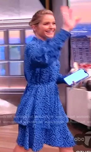 Sara Haines on The View on ABC was spotted wearing this blue spotted mini dress on The View on Feb 17 2023's episode. Sara's Dress is the Leopard-print shirt dress by Proenza Schouler.