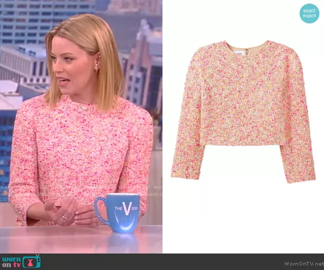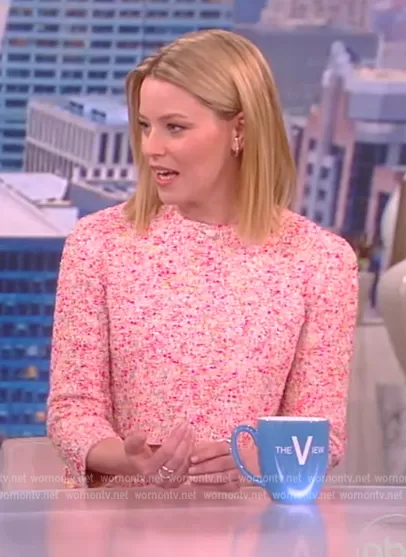 on The View on ABC was spotted wearing this Elizabeth Banks’ pink tweed top and skirt on The View on Feb 20 2023's episode. 's Top is the Novelty Textured tweed top by St. John . 's Skirt is the Bonded Novelty tweed skirt by St. John.