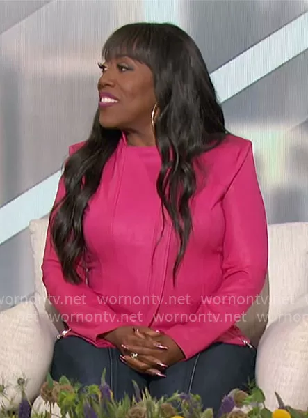 Sheryl Underwood on The Talk on CBS was spotted wearing this pink leather jacket on The Talk on Jun 14 2024's episode. Sheryl's Jacket is the Liquid Leather Signature Jacket - Magenta by Clara Sunwoo.