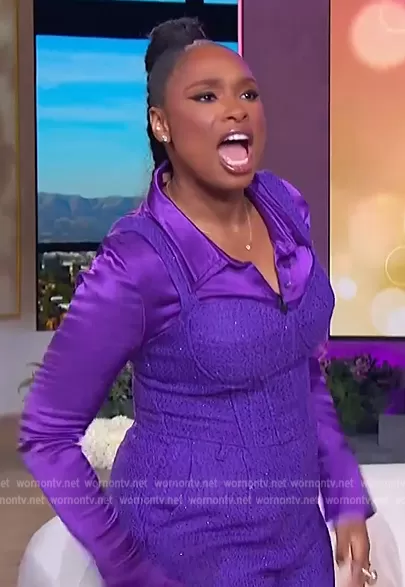 Jennifer Hudson on The Jennifer Hudson Show on FOX was spotted wearing this purple tweed top and pants on The Jennifer Hudson Show on Feb 20 2023's episode. Jennifer's Top is the Tweed Bustier Top by Aqua x Maeve Reilly . Jennifer's Pants is the Tweed Pants by Aqua x Maeve Reilly.