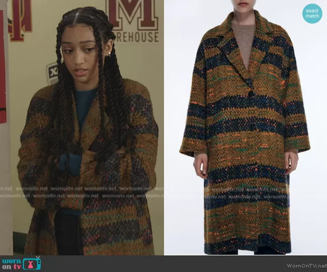 Olivia Baker (played by Samantha Logan) on All American on CWTV was spotted wearing this stripe tweed coat on All American on episode 'Lost One' (5x12) in Feb 2023. Olivia's Coat is the Textured Wool Blend Coat by Zara.