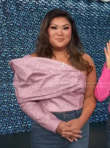 on Access Hollywood on NBC was spotted wearing this metallic one shoulder top on Access Hollywood on Feb 21 2023's episode. 's Top is the Structured One Shoulder Top in pink glitter by Asos Luxe.