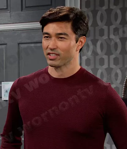 Li Shin (played by Remington Hoffman) on Days of our Lives on Peacock was spotted wearing this burgundy print sweater on Days of our Lives on Feb 22 2023's episode. 's Sweater is the Micro Pattern Wool Crewneck Sweater by Emporio Armani.