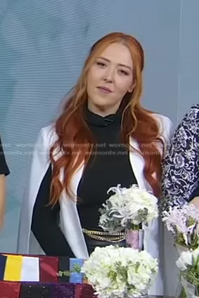 on Good Morning America on ABC was spotted wearing this white cape jacket on Good Morning America on Feb 22 2023's episode. 's Jacket is the Upas Cape by Bcbgmaxazria.