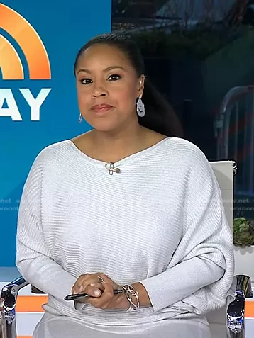 Sheinelle Jones on Today on NBC was spotted wearing this ribbed dolman sleeve sweater on Today on Feb 23 2023's episode.