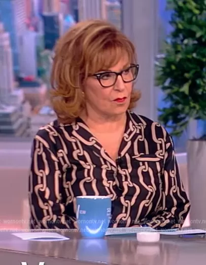 Joy Behar on The View on ABC was spotted wearing this black chain print blouse on The View on Feb 23 2023's episode. Joy's Top is the Juste Chain-Print Satin Shirt by Nili Lotan.