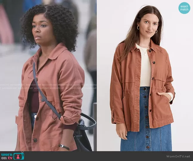 Simone Griffith (played by Alexis Floyd) on Greys Anatomy on ABC was spotted wearing this pink jacket on Greys Anatomy on episode 'I'll Follow the Sun' (19x07) in Feb 2023. Simone's Jacket is the Ashgrove Chore Jacket by Madewell.