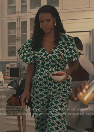 Vivian Banks (played by Cassandra Freeman) on Bel-Air on Peacock was spotted wearing this green printed jumpsuit on Bel-Air on episode 'A Fresh Start' (2x01) in Feb 2023. Viv's Jumpsuit is the Tara African Print Infinity Jumpsuit by Ofuure.