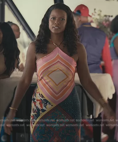 Vivian Banks (played by Cassandra Freeman) on Bel-Air on Peacock was spotted wearing this printed satin halter dress on Bel-Air on episode 'A Fresh Start' (2x01) in Feb 2023. Viv's Dress is the Cubism Mix Print Satin Maxi Dress by Staud.