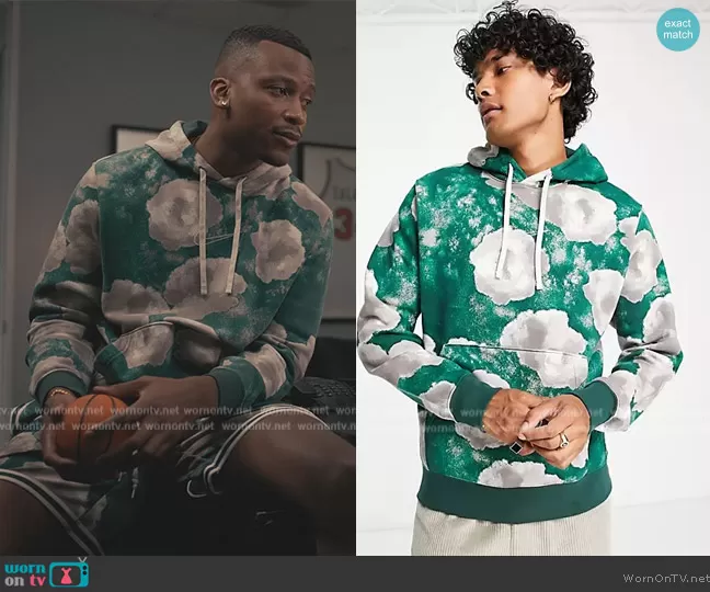 (played by ) on Bel-Air on Peacock was spotted wearing this Green floral print hoodie on Bel-Air on episode 'A Fresh Start' (2x01) in Feb 2023. 's Sweater is the Floral all over burnout print hoodie in green by Nike . 's Shorts is the Floral all over burnout print shorts by Nike.