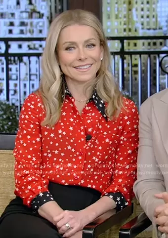 Kelly Ripa on Live with Kelly and Mark on Disney ABC Home Entertainment was spotted wearing this red contrast star print blouse on Live with Kelly and Ryan on May 29 2023's episode. Kelly's Top is the Printed silk crepe de chine shirt by Miu Miu.