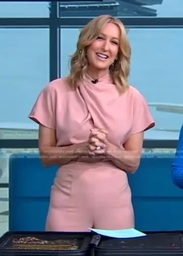 Lara Spencer on Good Morning America on ABC was spotted wearing this pink crossover neck jumpsuit on Good Morning America on Feb 24 2023's episode. Lara's Jumpsuit is the Estella Mock Neck Jumpsuit by Black Halo.