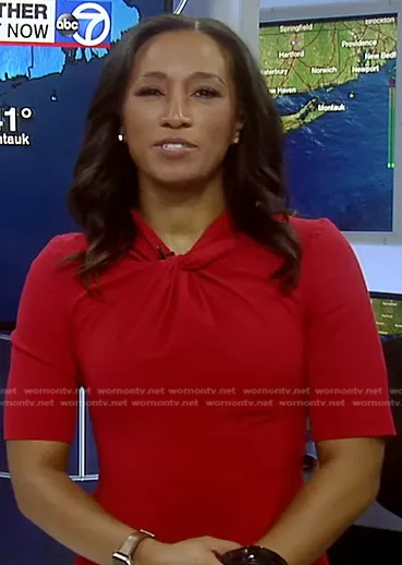 on Good Morning America on ABC was spotted wearing this red twist neck dress on Good Morning America on Feb 06 2026's episode. 's Dress is the Caterina Dress by LK Bennett.
