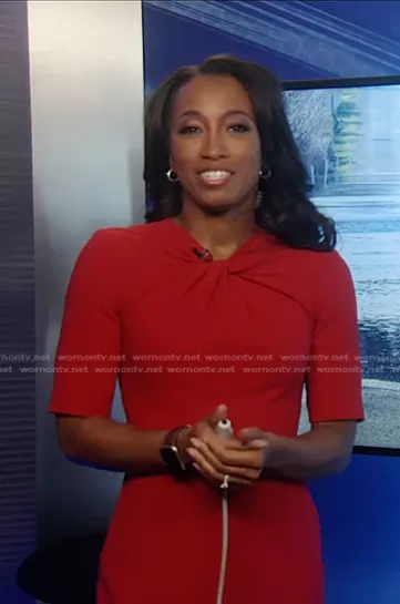 on Good Morning America on ABC was spotted wearing this red twist neck dress on Good Morning America on Oct 08 2024's episode. 's Dress is the Caterina Dress by LK Bennett.