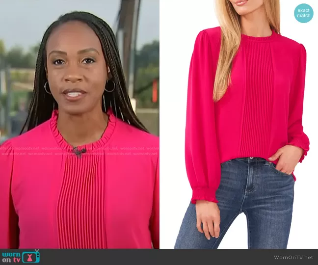 on Today on NBC was spotted wearing this fuchsia pintuck blouse on Today on Aug 24 2023's episode. 's Top is the Pintucked Long-Sleeve Blouse in Bright Geranium by Cece.