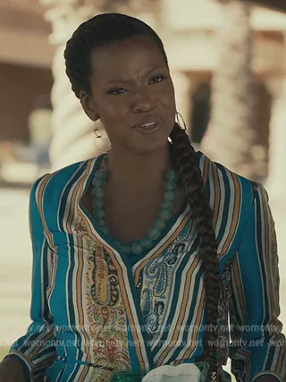 Vivian Banks (played by Cassandra Freeman) on Bel-Air on Peacock was spotted wearing this blue paisley print tie waist blouse on Bel-Air on episode 'Compromised' (2x03) in Feb 2023. Viv's Top is the Amber Silk Wrap Jacket by Etro.