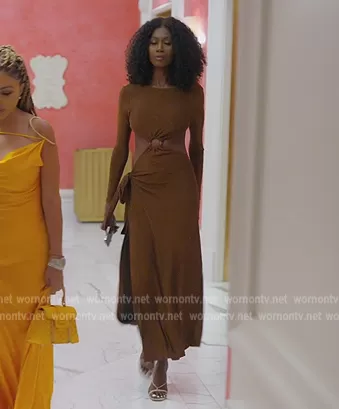 Kiki Barth (played by Kiki Barth) on The Real Housewives of Miami on Peacock was spotted wearing this brown ring detail cutout dress on The Real Housewives of Miami on episode 'Lines in the Sand' (5x15) in Feb 2023. Kiki's Dress is the Christina Backless Maxi Wrap Dress by Meshki.