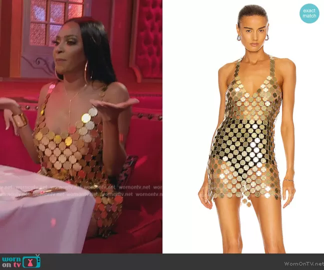 Guerdy Abraira (played by Guerdy Abraira) on The Real Housewives of Miami on Peacock was spotted wearing this gold chain mail mini dress on The Real Housewives of Miami on episode 'Lines in the Sand' (5x15) in Feb 2023. Guerdy's Dress is the Cara Dress by Fannie Schiavoni.