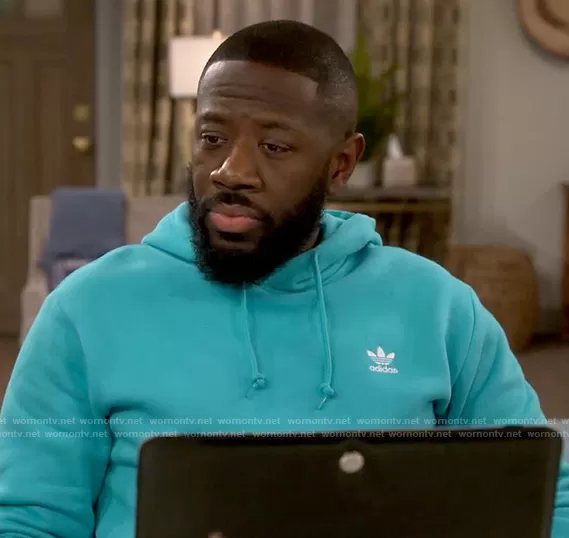 Malcom (played by Sheaun McKinney) on The Neighborhood on CBS was spotted wearing this turquoise Adidas hoodie on The Neighborhood on episode 'Welcome to New Beginnings' (5x14) in Feb 2023. Malcolm's Sweatshirt is the Adicolor Essentials Trefoil Hoodie in Semi Mint Rush by Adidas.