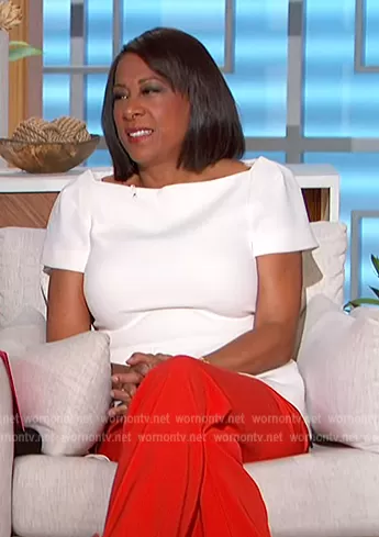 on The Talk on CBS was spotted wearing this white peplum top on The Talk on Feb 27 2023's episode. 's Top is the Draped-Peplum Short-Sleeve Poplin Blouse by Roland Mouret.