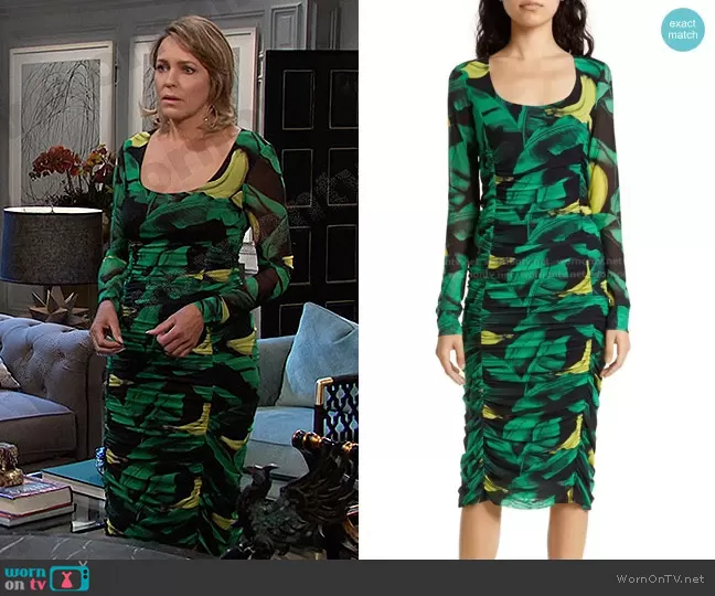 Nicole Walker (played by Arianne Zucker) on Days of our Lives on Peacock was spotted wearing this leaf print scoop neck dress on Days of our Lives on Feb 28 2023's episode. Nicole's Dress is the Ruched Scoop Neck Long Sleeve Midi Dress by Ganni.