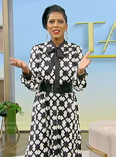 Tamron Hall on Tamron Hall Show on ABC was spotted wearing this printed tie neck dress on Tamron Hall Show on Feb 28 2023's episode. Tamron's Dress is the Rhombus tile-print silk-twill maxi dress by Gucci.